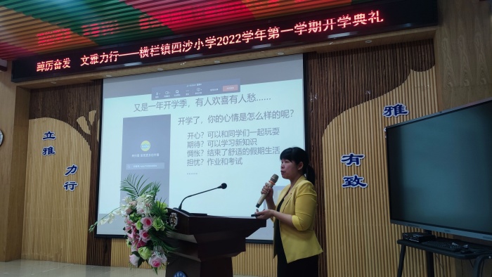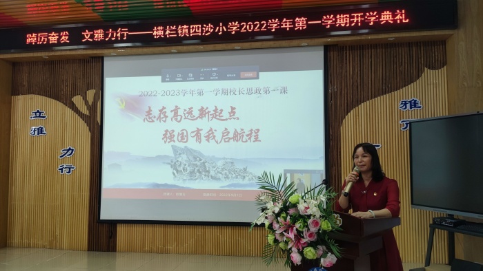 云天收夏色,木葉動秋聲。金色的秋季敲開了新學期的大門,四小的孩子們惜別五彩斑斕的暑假,迎來了嶄新的學年。2022年9月1日上午,四沙小學舉行了主題為“踔厲奮發(fā) 文雅力行”的2022-2023學年度第一學期開學典禮。五11班、六1班全體師生和各班三好標兵代表以及學校全體行政在階梯室主會場參與,其他班級師生通過釘釘直接收看。四沙小學法制副校長冼桂民、四沙小學家委會會長杜信銳蒞臨指導。