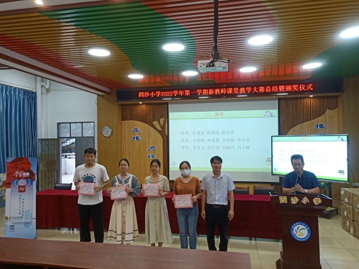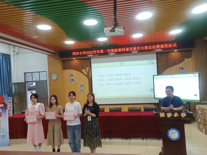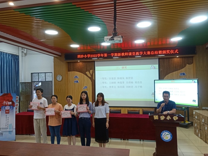2022年11月14日,四沙小學2022年新進教師課堂教學大賽揭曉:區曼恩、陳曉嵐和陳伊柔三位老師榮獲一等獎;王麗娟、林蘊菁、吳倩楠、蔣浩堅等老師等榮獲二等獎;李常文、張優霞、劉映君、馮子晴等老師榮獲三等獎。