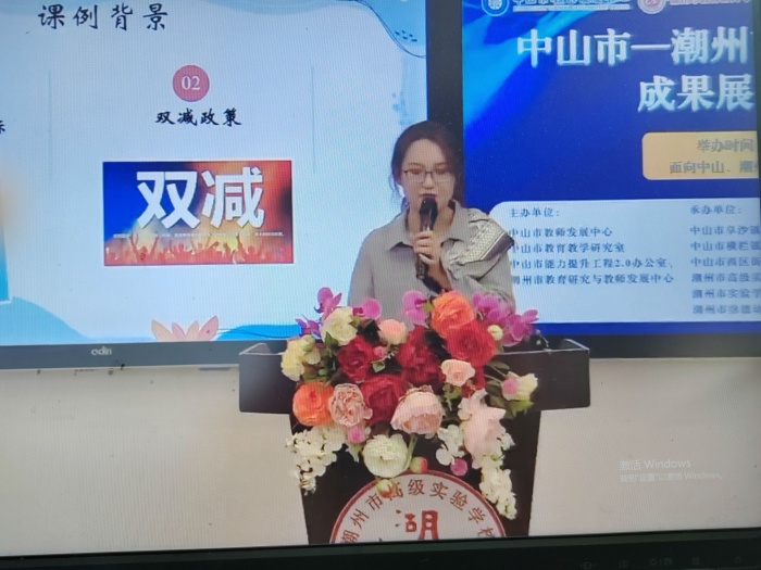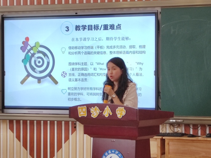 當天下午,在潮州市高級實驗學校吳歆樺老師的主持下,活動正式開始。潮州市高級實驗學校許燕燕老師和中山市橫欄中學王欣老師先后展示了課例《Unit 9 My favorite subject is science》。隨后,兩位執教老師結合自己的課堂,從教學目標、解決重難點策略、方法及工具,課后反思等幾個方面進行了說課,充分體現了中山、潮州兩地基于信息技術能力提升2.0下的課堂教學的異同。