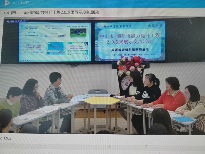 潮州市高級實驗學校和中山市阜沙中學英語科組先后分享了英語科組研修成果,各有千秋。潮州市高級實驗學校英語科組團隊圍繞《立足課堂、技術賦能——創新融合》,從積極參與有序開展校本研修、結合實際融合創新教學模式和依托現有最大化2.0信息技術等三個方面分享該科組的研修經驗。中山市阜沙中學英語科組團隊具體從線上線下結合、多種形式混合研討、校本資源充分利用等幾個方面分享了《基于希沃平臺的“讀后結寫”集體磨課》研修實踐過程。