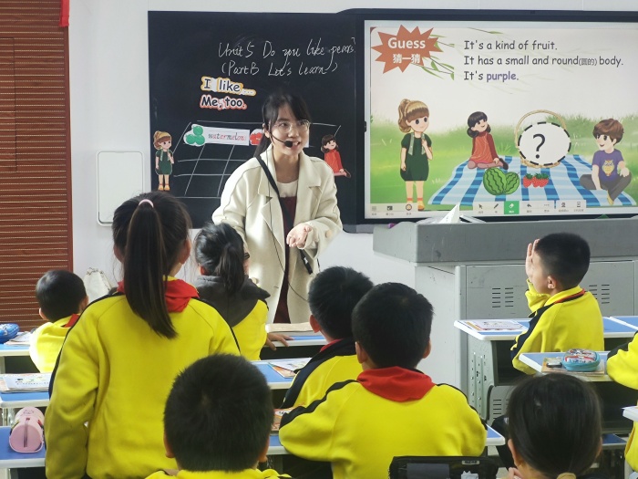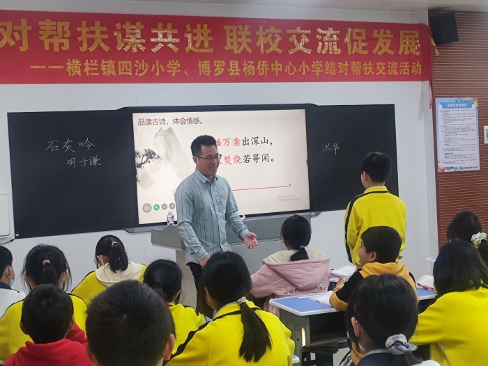 次日,橫欄四沙小學組織梁洪華、黃麗芬、司徒嘉穎三位語數英名師(骨干)代表在楊僑中心小學開展名師送教活動。活動中,三位老師分別展示三節精彩紛呈的示范課——梁洪華老師執教《石灰吟》,黃麗芬老師執教《比例的意義》,司徒嘉穎老師執教《Unit5 Do you like pears?(PartB Let’s learn)》。梁老師的課注重教學目標的落實,體現了以生為本、以學定教,能結合學情和生活實際合理安排教學活動;黃老師的課堂氣氛活躍,學生積極思考,語言表達流暢、生動;司徒嘉穎老師的課關注學生發展,借助信息技術充分調動了學生積極性,有效培養學生動手實踐能力和合作學習能力。他們的課堂教學環節緊湊、張弛有度,教師的教學基本功扎實,對教材理解透徹,對重難點把握精準。課后,楊僑中心小學的老師們對梁洪華、黃麗芬、司徒嘉穎三位老師的課堂給予了高度評價,并與兩校老師展開了熱烈的研討交流。