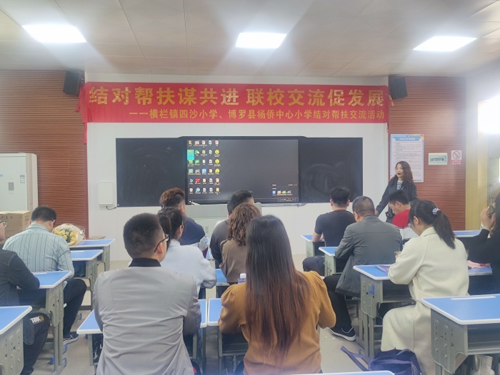 贈送儀式結束后,橫欄鎮四沙小學與楊僑中心小學結對幫扶座談會在會議室召開。黃日彪校長首先介紹了該校的基本情況,陳述了現有的做法和未來的規劃等,并表示將以此為契機,進一步加強學校的管理和教學教研工作,為促進學校全面發展而努力。與會人員就德育、教研、信息技術2.0和教育評價等多方面進行探討,對比兩校的差異性,力求因材施教,因校制宜。