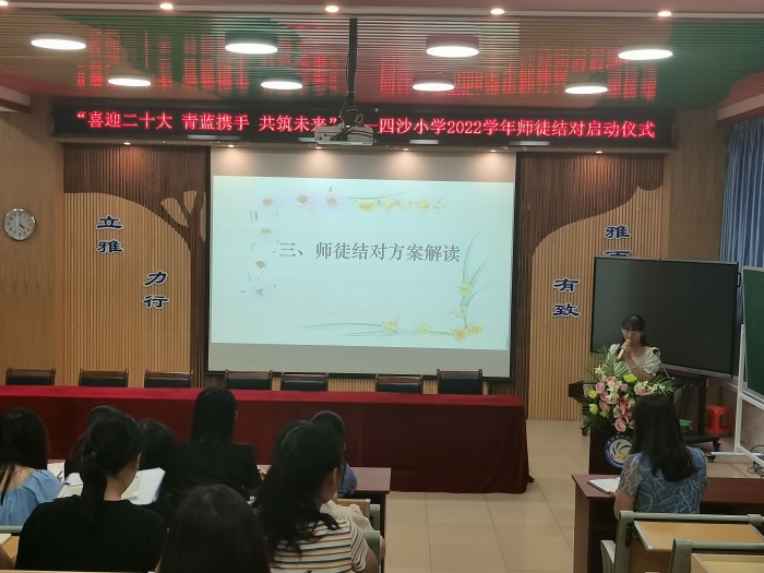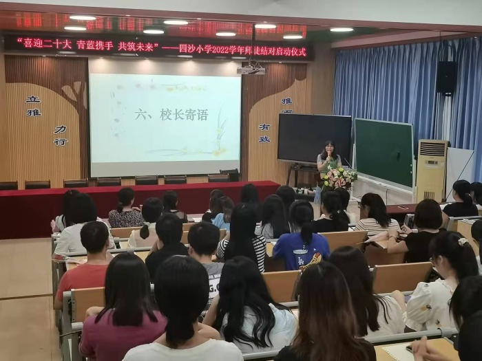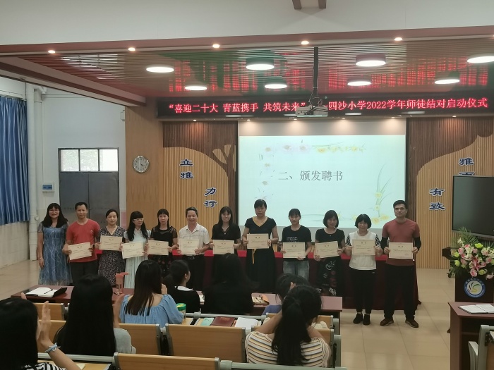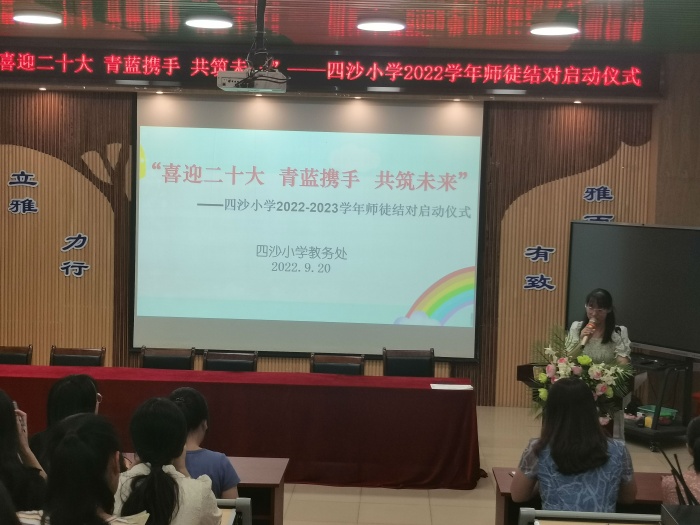 為了進一步提升學校辦學水平,提高新教師的教育教學能力,促進教師團隊協調、高質量發展,2022年9月20日下午,四沙小學在階梯室舉行了2022-2023學年師徒結對啟動儀式,教務處全體成員、相關師徒結對教師參加了會議。會議由教務處副主任黃麗芬主持。