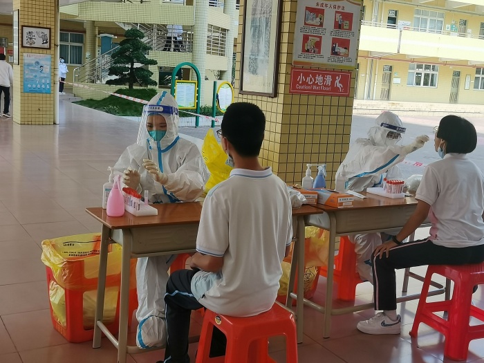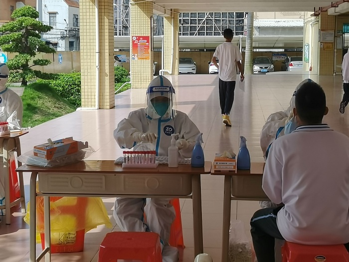 在正式開始檢測前一個小時,橫欄中學采樣點所有工作人員、醫(yī)務人員及教師志愿者就已全部到崗到位,橫欄中學總務處黃富榮主任現(xiàn)場指揮調(diào)度,統(tǒng)籌協(xié)調(diào)安排物資和人員;醫(yī)務人員、志愿者、收樣員和醫(yī)廢處置員在指定區(qū)域穿戴防護服;志愿者們有的在查驗前來做核酸檢測的師生的健康碼、行程碼,有的在給師生登記核酸檢測信息,橫欄中學全體師生積極配合、排隊有序,全體工作人員業(yè)務嫻熟、耐心細致,現(xiàn)場秩序井然,核酸檢測工作高效順利開展,截止上午11點,圓滿完成既定采樣任務。