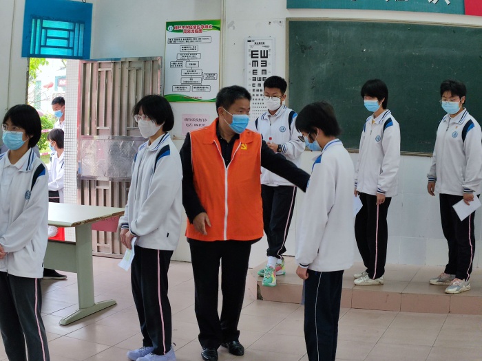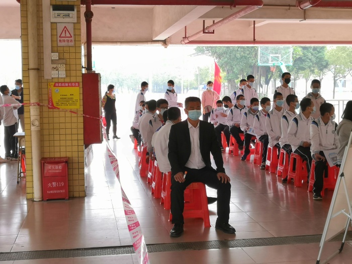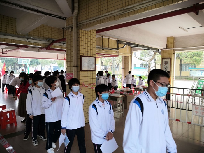 橫欄中學參加本次核酸檢測的師生共有3000多人,分初三、初二、初一三個批次,共6條檢測通道,依次開展檢測。在參加檢測前,學校相關部門和班主任做了大量的準備工作,提前收集好了學生的葵花碼,劃定了進場路線、排隊區、待檢區、檢測區等區域,大大保證了現場的安全、有序、高效。