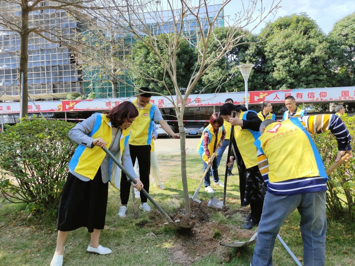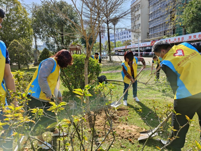 在簡單的捐贈儀式過后,植樹活動正式開始。大家一起填土、踩實、锨土,個個干勁十足,忙得熱火朝天,互幫互助地將一棵棵紫花風鈴樹苗栽入土中,為新年播下充滿希望的綠色。在場的同志用自己的汗水和專注為“最美橫中校園”增添一抹綠色。