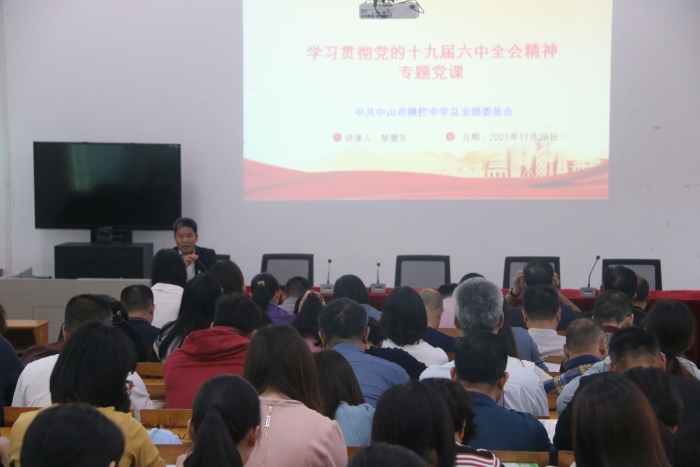 11月29日下午,中山市橫欄中學(xué)全體教師集中學(xué)校階梯室,召開黨的十九屆六中全會專題學(xué)習(xí)會議。學(xué)校黨總支書記、校長黎碧東為全體教師上了學(xué)習(xí)貫徹中國共產(chǎn)黨第十九屆六中全會精神專題黨課。