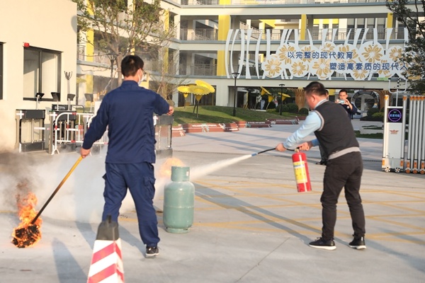 同時,劉指導員講解和示范了滅火器的使用,在消防員的指導下,同學們學習了滅火器材的使用方法,學生、教師代表輪流對燃燒物進行滅火演練,做到敢用、會用滅火器。