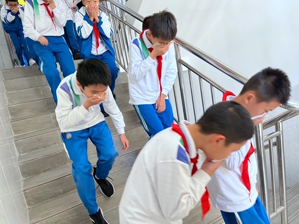 當自救警報響起后,生活老師在宿舍迅速組織學生逃離宿舍,自成兩路縱隊,按規劃好的疏散線路下樓,迅速、有序、安全地緊急疏散撤離宿舍樓,到達空曠操場上指定的地點集中,老師清點人數后向現場指揮報告情況,無一人發生跌倒摔傷事故,疏散演練井然有序,達到了預期的效果。