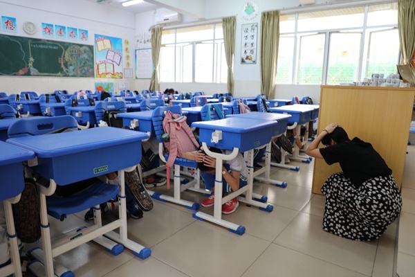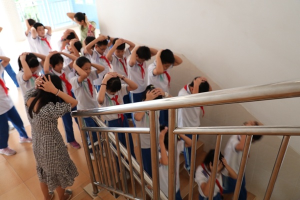 這次演練活動,全校師生給予了高度重視,前期的安全教育,演練的有條不紊,后期的總結提升,一切都按計劃進行。上午9:30分,隨著警報聲在校園里急促響起,參演師生快速反應,躲進桌下,就近緊急避險,警報聲結束,同學們在正副班主任的組織下,迅步走出課室,秩序井然地按指定路線快速疏散,各個樓層負責老師最后進行確認,保證沒有一個學生滯留,全部學生在最快時間內疏散到指定的安全地點,班主任向場地負責人報告人數。