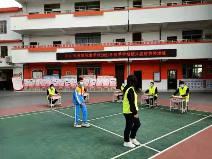 上午9:10,六年級的學生代表,分別模擬了分批入校檢測、教室上課發現異常學生等場景開展實地演練。重點演練了以下場景:在疫情低風險區,學校周一上午9時接到通報,雛鷹學校一名學生出現了發熱、咳嗽現象,經初步診斷為新冠肺炎病例的密切接觸者,被轉運后該生核酸檢測結果呈陽性,經摸查,該生的密切接觸者共有50人。發生疫情后,學校啟動應急預案,醫療保障組、消毒組、安全后勤保障組、信息聯絡組及宣傳和心理組做好應急準備。