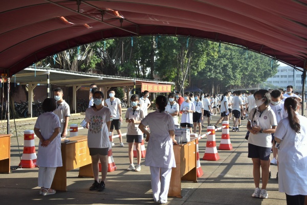 今年體育中考與往年最大的不同是,疫情防控工作貫穿始終。上午7點30分,黃圃鎮中學初三學生在學校廣場集合,分批進入考點,在進入考點前先測量體溫,隨后進入檢錄區,考生攜帶身份證、準考證,經檢驗后進入考場。考場內醫護組、供電組嚴陣以待,預防各種突發狀況;考場外保衛組嚴格控制人員進出,全力保證考場安全。考生們則在良好的環境中順利進行考試,籃球半場上籃、足球運球繞桿、跳繩、立定跳遠、長跑,每個項目都在有序進行,不時傳來考生們激動的歡呼聲。