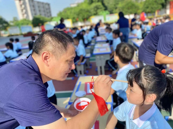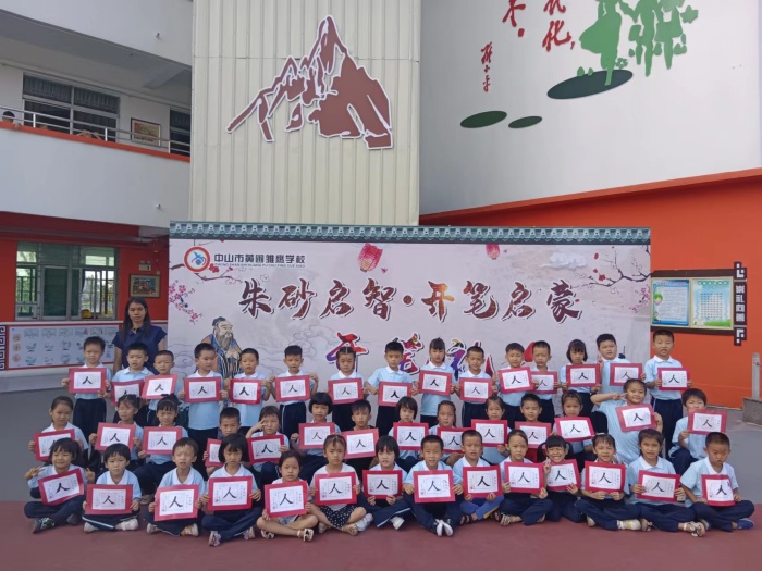 老師們手捧朱砂提到孩子們前面,在他們的額頭中間點上紅印,祝福他們從此眼亮心明!劉三虎老師和吳花朋兩位書法老師,手握毛筆在宣紙上一撇一捺寫下“人”字,“人”是一個筆畫簡單而意義深遠的漢字,寓意在人生的啟蒙階段,學會做人是最為重要的。老師教學生執筆,然后在紙上寫下一個人字,由學生臨摹,表明這一天你開始是真正意義上的一個人。希望孩子們開始讀書、寫字后能學有所成,做一個對社會有益的人!