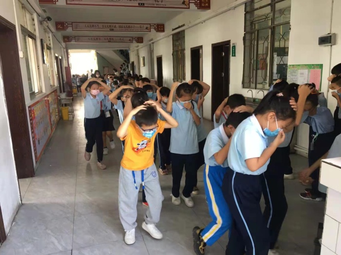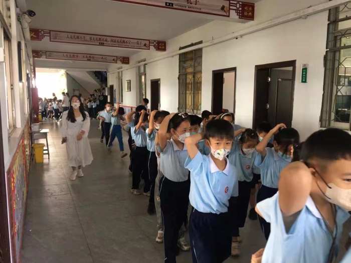 演練正式開始,值班人員立即拉響警報,并撥打報警電話。隨著一聲聲消防預警號的響起,各班教師快速、有序地按照安全疏散路線帶領同學們用手或紙巾捂住口鼻、彎下身體,冷靜、快速疏散到操場。