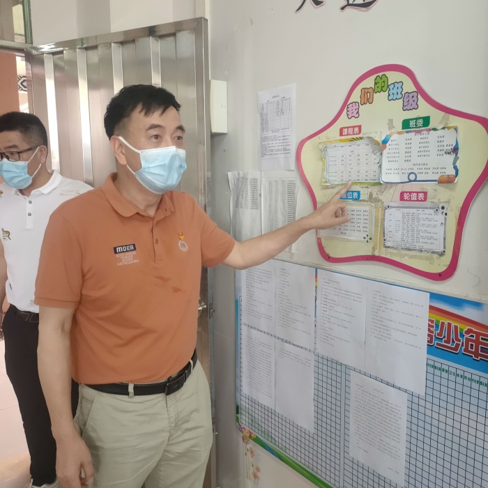 為全面貫徹黨的教育方針,落實立德樹人根本任務,強化校園疫情防控工作常態化管理,確保各個環節扎實、有序推進,5月24日下午,中山市督學袁港喜同志到大岑小學進行“規范辦學工作”“安全教育”“疫情防控”全面督導檢查。大岑小學梁慶堂校長、教務處梁轉弟主任、梁桂香副主任迎接督導檢查。