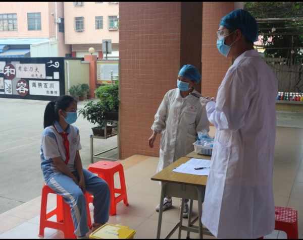教室上課過程中,有位學生身體不適,科任老師立馬上前詢問,并用額溫槍測量該生體溫,顯示37.8℃。老師讓同學們戴好口罩,安撫學生情緒,在座位上等待下一步處置,同時撥通校醫和班主任的電話。校醫把該生接到臨時隔離間,復檢體溫,詢問流行病學史,做出相應的處置。而班主任馬上電話聯系該生家長來校協助,并把其他學生轉移到備用教室。后勤人員隨即對原教室全面消毒。