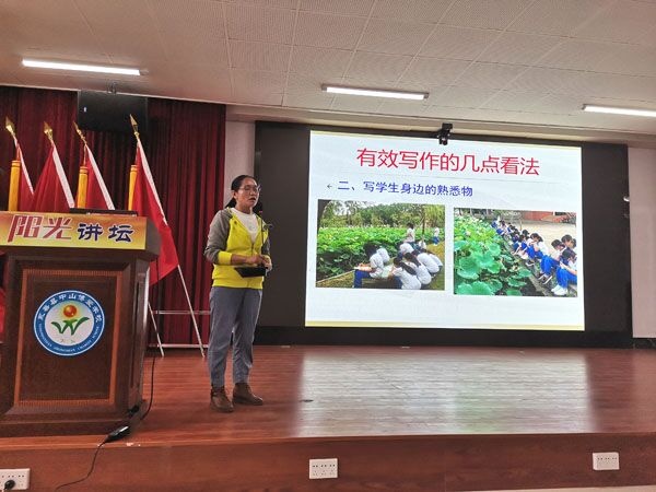 講座中黃老師介紹了馬新中學的基本情況,比如學生都是來自于農村和外來工子弟,這和紅光學校也有相似之處,一下拉近了大家的心理距離。黃彩媚老師重點介紹了有效開展科組教研活動的具體操作方式。她說教研活動要充分發揮備課組作用才能更好的提高同科組的教學質量,并介紹了馬新中學各科組開展的豐富多彩的學生活動,如手抄報、知識競賽、猜謎語、演講等活動。黃老師還給根據自己的教學經驗,介紹了激發學生學習斗志的方法和具體操作過程。