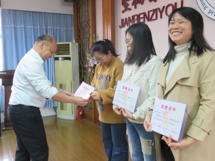 培紅小學的班主任、輔導員隊伍表現出色,在上個學期獲獎不少,碩果累累!梁惠鵬校長為她們一一頒獎。其中潘佩芬老師獲2020-2021年度“黃圃鎮光榮在崗二十年少先隊輔導員”稱號,冼煒賢老師、梁桂珍老師獲2020-2021年度“黃圃鎮光榮在崗十年少先隊輔導員”稱號。賴金玲老師獲得2020年“淬煉師德師能,踐行育人使命”師德主題征文活動中,獲小學組三等獎。梁桂珍老師、郭鳳珍老師、吳敏濤老師獲2020-2021年度“黃圃鎮優秀少先隊輔導員”稱號。