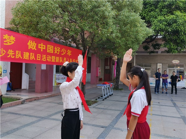隊歌唱罷,大隊輔導員梁老師宣讀新隊員入隊名單后,新隊員在四位輔導員的帶領下有序進場,五六年級的老隊員代表們為新隊員們戴上了鮮艷的紅領巾。這一刻,新隊員的心中仿佛都浪濤翻滾,感到無比神圣和自豪。是的,紅領巾是光榮的代表,戴上紅領巾,心中就有了信念,有了希望,有了前行的方向和力量。緊接著,由大隊輔導員帶領新隊員在隊旗下宣誓,洪亮的宣誓聲久久回蕩在校園的上空。