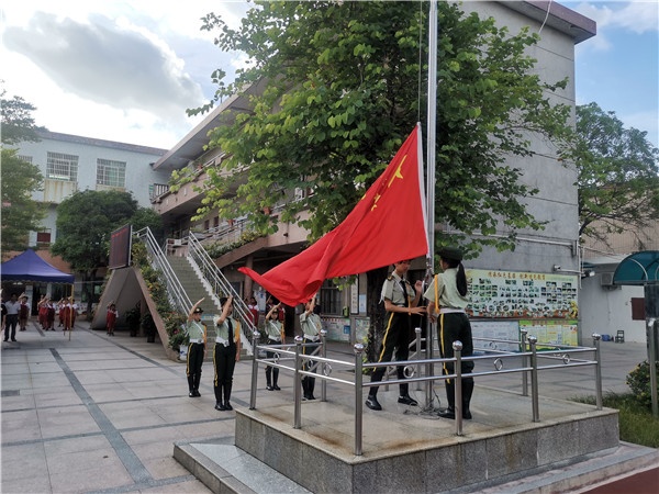洪亮的國歌聲響起,縈繞整個校園,全體師生莊嚴肅穆,面向國旗,精神飽滿地瞻仰國旗,迎接新的周一。