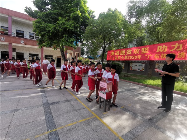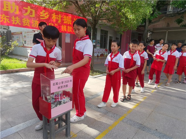 接著,由大隊輔導員梁毅強老師主持石軍小學2020年“扶貧濟困日”捐款活動,梁老師先向全校師生講述了樂善好施、扶貧濟困是中華民族的傳統美德,希望師生們團結行動起來,積極參與,為廣東貧困戶人口脫貧,實現全面建成小康社會目標作出貢獻。隨后,由梁蔚菁校長帶領石軍小學全體老師進行整齊而有序的捐款,給全體同學做了積極的示范。然后每個年級按著順序,有條不紊地、一個接一個地進行捐款。