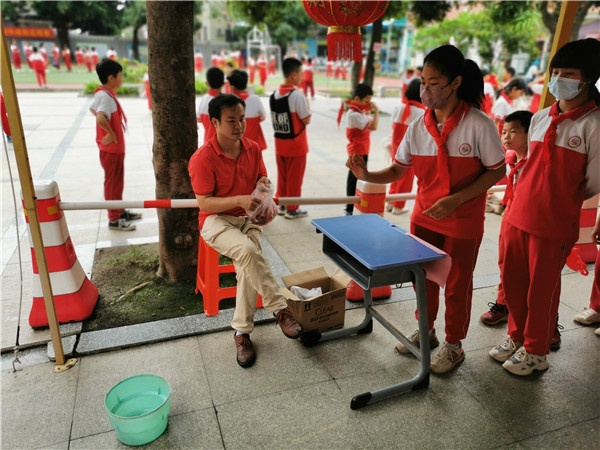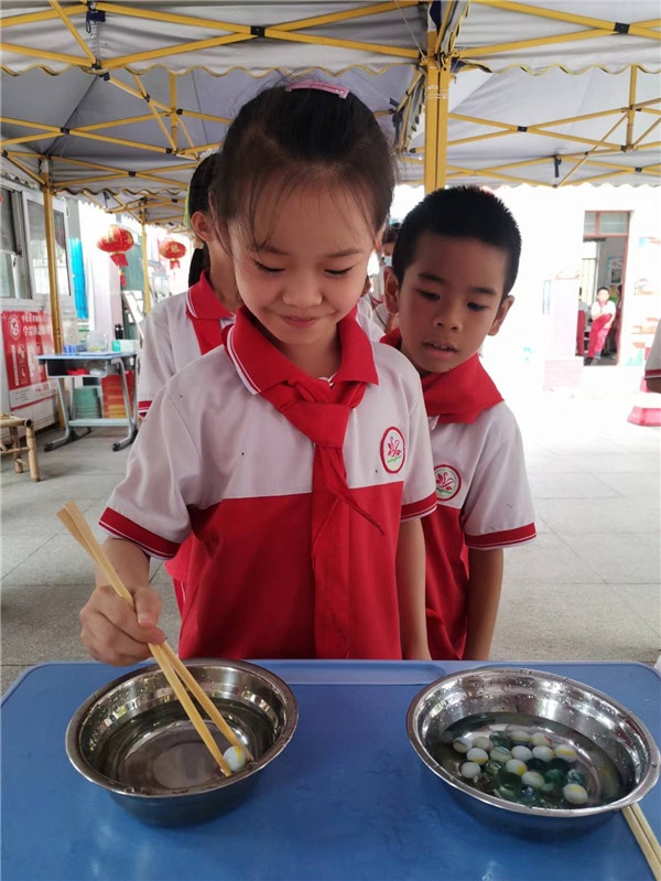 參觀完書畫作品展,接著便是精彩的游園活動了。游園活動的項目可謂豐富多彩,有盲公打球、投籃、足球射門、水中吹球、夾玻璃球、套圈等等。活動一開始,隊員們都朝著自己喜歡的項目去排隊,一個接著一個、井然有序地參加活動。有的隊員,剛剛參加完這個游戲項目,感覺還不盡興,又到后面重新排隊,繼續新一輪的“游戲”;有的隊員,參加完這個項目,贏得“大滿貫”,便跑去其他項目去了。不管是哪一個項目,都排滿了人,他們積極參與的“熱情”好像一團火,熊熊燃燒,直到游戲結束后,依然是熱情高漲,“火氣沖天”。