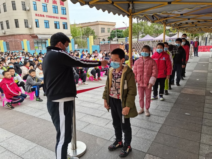 全體師生為了不扎堆、不拖手、不搭肩,采取三條通道進入校園。學生根據(jù)地面標識間隔保持在前后一米,有序排隊,等待晨檢。保安人員在校門口分列兩邊負責保衛(wèi)安全;值日行政、值日組長維持學生隊列秩序,進行晨檢工作。等候體溫檢測時,人與人間隔1米以上有序接受體溫檢測。如檢測到體溫異常學生時,由值日組長即刻陪同學生帶到第一篩查點,由老師為該學生戴上口罩,由專門人員帶到校園正門臨時隔離點。