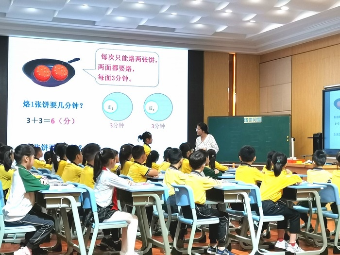 上課伊始,楊老師首先與孩子們分享了自己的煎餅早餐,瞬間拉近了與學(xué)生的距離,在與學(xué)生交流的過程中引入生活中的烙餅問題,激發(fā)了學(xué)生對(duì)烙餅興趣的探究。楊老師從1張餅的烙法,引導(dǎo)學(xué)生烙2,3,4,5張……,讓學(xué)生在討論、交流、動(dòng)手操作中,發(fā)現(xiàn)問題,解決問題,并總結(jié)規(guī)律。楊老師給予學(xué)生足夠的時(shí)間進(jìn)行操作,并展示學(xué)生的烙餅方法,讓學(xué)生自己歸納出怎樣烙餅是更省時(shí)的優(yōu)化方案,整節(jié)課重點(diǎn)突出,將難點(diǎn)讓學(xué)生通過動(dòng)手操作很好地突破了。楊老師通過有層次性的練習(xí),引發(fā)學(xué)生對(duì)生活中的烙餅問題的思考,讓學(xué)生明白怎樣做事才能最省時(shí),才能更好地提高工作效率。