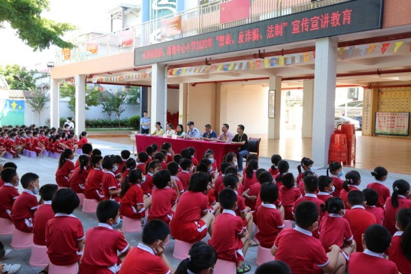 7月17日上午八點,本次法制安全教育活動在新地中心小學(xué)校園準(zhǔn)時開始。本次活動邀請了學(xué)校法制副校長、永安派出所副所長陳雄亮警官和黃圃鎮(zhèn)社工服務(wù)中心禁毒社工黃姑娘為大家主講。新地中心小學(xué)全體師生參加了本次活動。