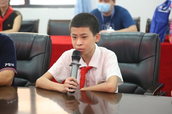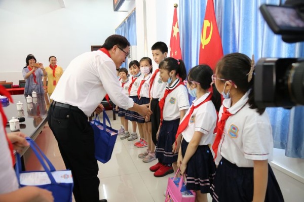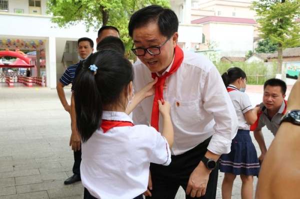 最后,鎮黨委書記關瑞麟發表講話,關書記為同學們講述了紅領巾的歷史,還以自己的成長故事激勵學生努力學習,實現自己的夢想,將來成為國家的棟梁,為祖國貢獻力量。關書記還要求孩子們學會感恩,要感恩社會,感恩父母,感恩老師,感恩他人。同時大力贊揚了學校的愛國主題教育和校園文化建設。接著為學生代表贈送了節日禮物,送上了節日祝福,表達了鎮黨委、鎮政府對學生學習、生活的關心之情。