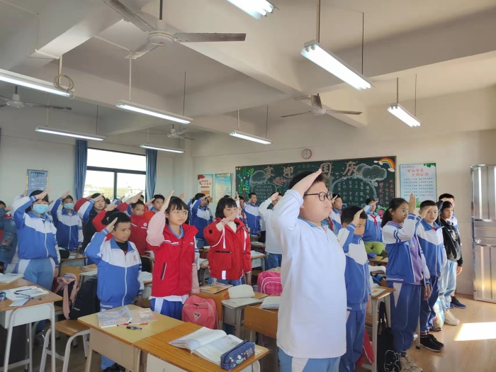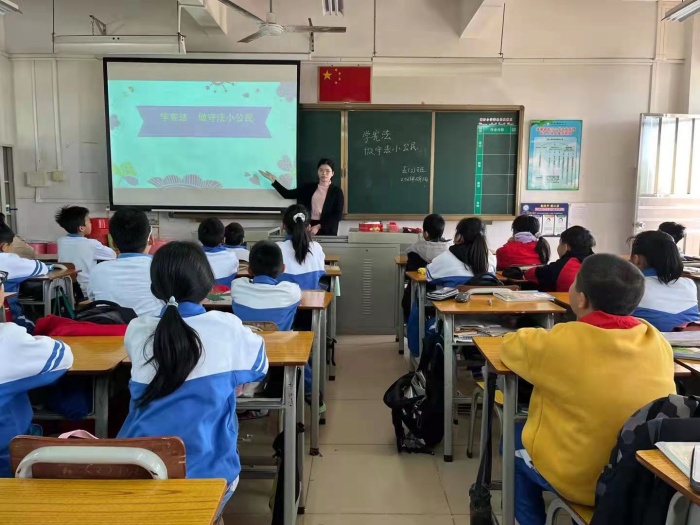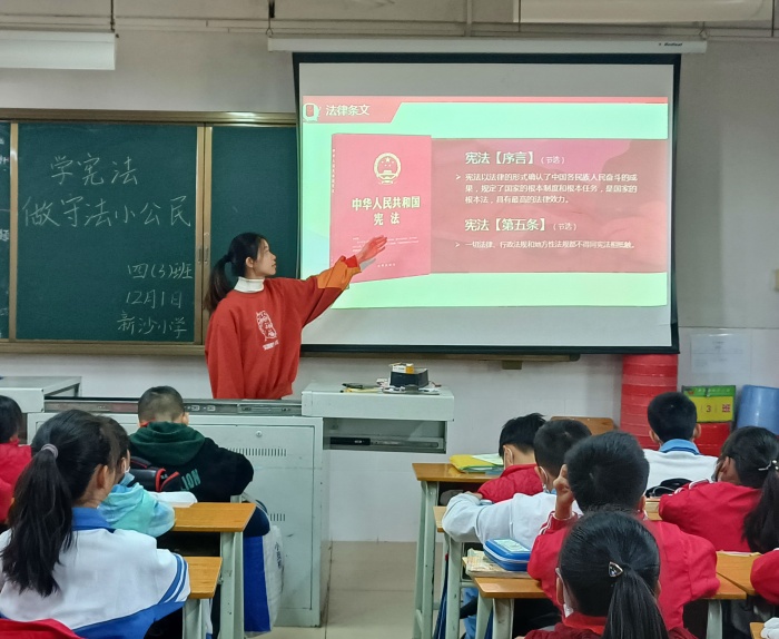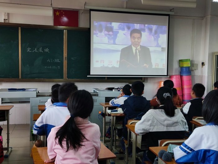 11月29日上午,在冬日的冷風中,同學們毅然挺直腰桿,在莊嚴的國旗下舉行了隆重的升旗儀式。12月1日新沙小學組織召開了“學憲法做守法小公民”主題班會活動。12月3日上午9時,新沙小學全體師生通過普法網觀看教育部在北京舉辦的“憲法晨讀”活動。國旗在莊嚴的國歌聲中徐徐升起,同學們面向國旗敬禮,齊唱國歌。9時05分,各班主任組織本班學生同步學習“憲法晨讀”的具體內容,師生齊聲朗讀憲法中的條款,當學生讀到不懂的地方時,班主任仔細進行講解,使學生感受到憲法的莊嚴與神圣,從而更加認真地遵守憲法和維護憲法權威。