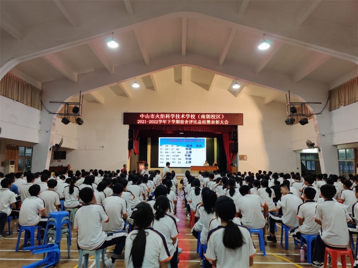 為提高宿舍文化活動“以評促建”的實效性,2022年6月29日傍晚,中山市火炬科學技術學校(南朗校區)2021-2022學年第二學期“‘寢’有獨鐘,‘宿’說文明”宿舍評比活動總結暨表彰大會在紫荊堂如期舉行。學校德育處副主任袁建、宿舍管理員丁元、生活老師王光華以及全體住宿生共計330余人參加了此次活動。