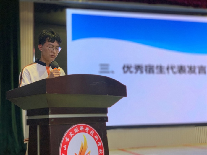 會議第四項,優秀宿舍代表21會計2班王賢同學、20設計班鐘倩怡同學,分別代表男女住宿生發言,分享他們在爭創優秀宿舍的一些心得體會,并倡議廣大住宿生們團結一致共同打造干凈整潔的宿舍環境。