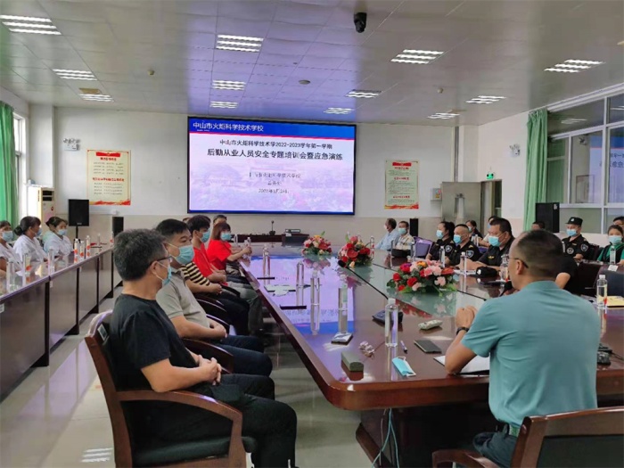 2022年8月28日上午,中山市火炬科學(xué)技術(shù)學(xué)校總務(wù)處在開發(fā)區(qū)校區(qū)黨員活動室召開校園安全專題工作會議。學(xué)校副校長梁建雄、總務(wù)處主任陳百良,以及學(xué)校總務(wù)處、物業(yè)團(tuán)隊(duì)與食堂員工等后勤部門全體工作人員共50多人參加了此次會議。會議由處陳百良主任主持。