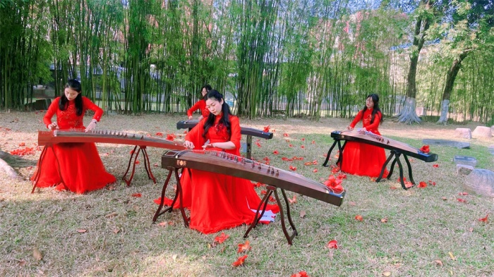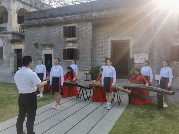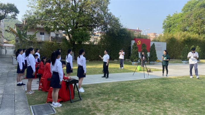 學校德育處、團委組織合唱隊、舞蹈隊以及古箏社團的同學,在張浩東、李賽花、楊漢光老師的帶領下,來到了楊殷故居,開展了一場融情入景的花下音樂會。通過古箏合奏、舞蹈表演、合唱等形式,演繹了《我的祖國》《星星之火》《我愛你!中國》等經典音樂作品,以詩意的方式緬懷楊殷烈士,致敬革命先烈。