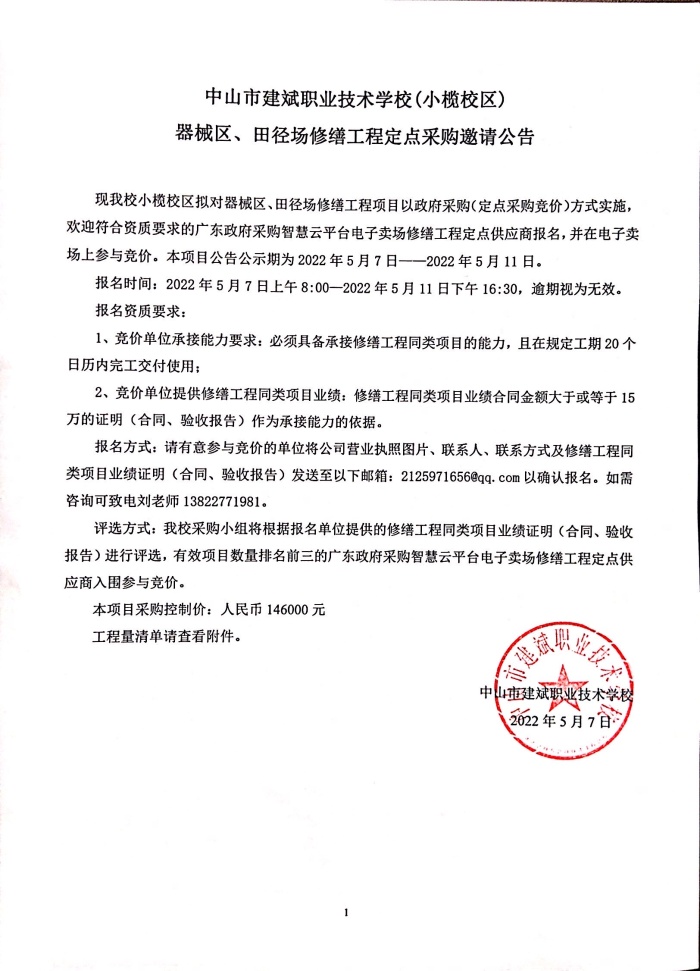 中山市建斌職業技術學校(小欖校區)器械區、田徑場修繕工程定點采購邀請公告
