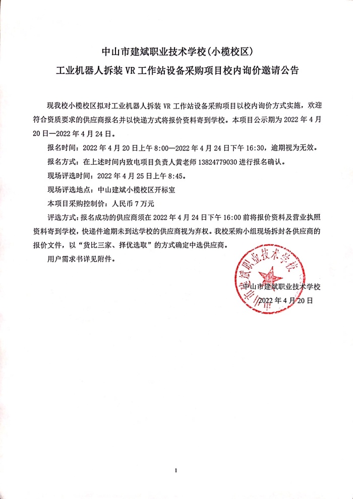 中山市建斌職業技術學校(小欖校區)工業機器人拆裝VR工作站設備采購項目校內詢價邀請公告