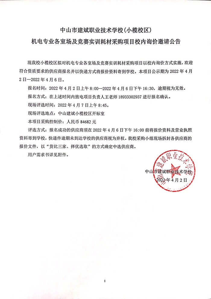 中山市建斌職業技術學校(小欖校區)機電專業各室場及競賽實訓耗材采購項目校內詢價邀請公告