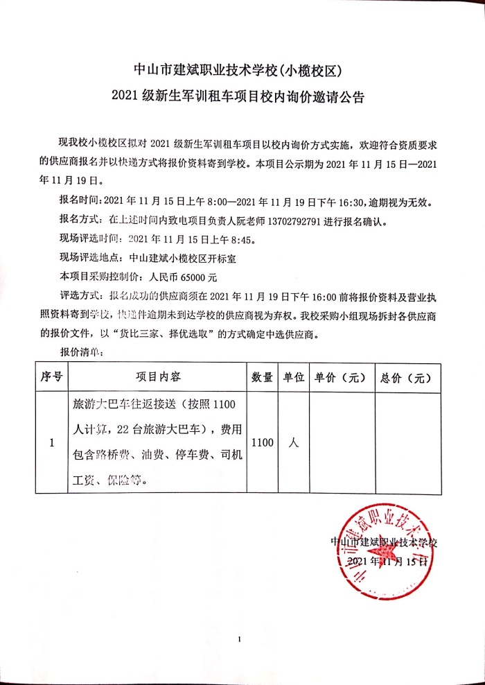 中山市建斌職業技術學校(小欖校區)2021級新生軍訓租車項目校內詢價邀請公告