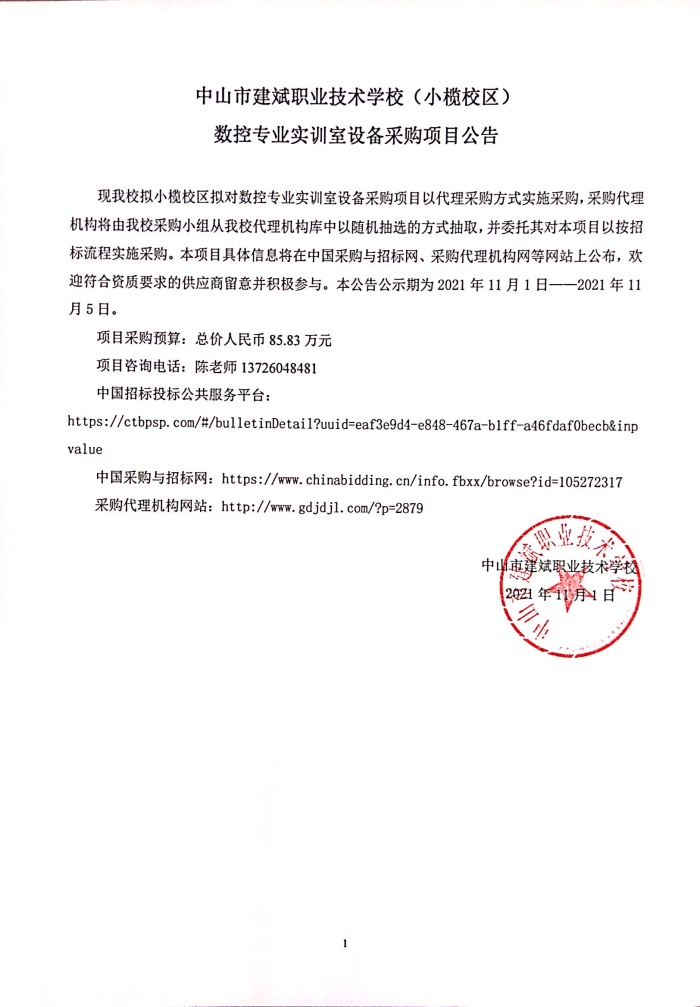 中山市建斌職業技術學校(小欖校區)數控專業實訓室設備采購項目公告