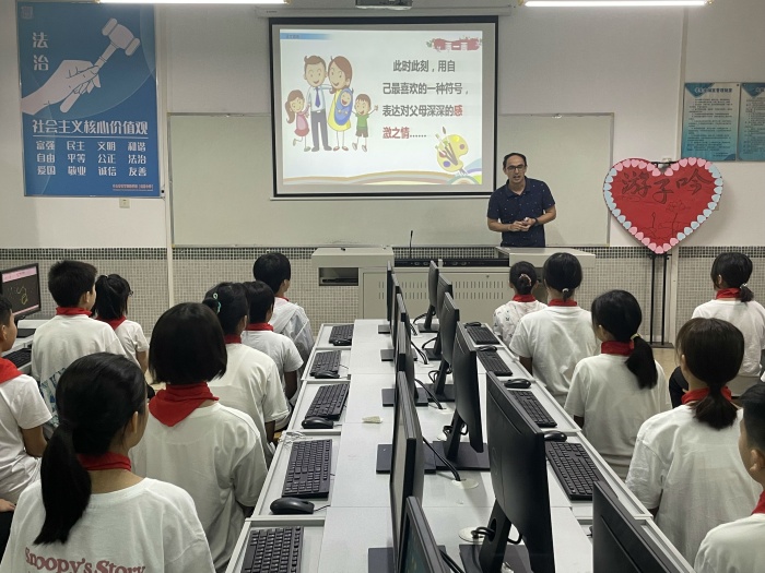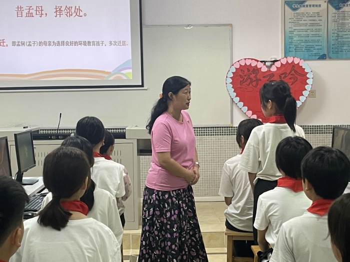 此次教學活動,圍繞五年級語文經典誦讀篇目《游子吟》展開,以語文誦讀為基礎,融入音樂、美術等藝術元素,最后依托信息技術對課堂學習效果進行評價。在課堂教學展示環節,先由劉紅麗老師引入“孟母三遷”的小故事,觀看視頻后同學們紛紛發表了自己的感想,通過小故事讓同學們意識到:父母用心良苦,竭盡全力培養孩子,從而過渡到下一環節《游子吟》。語文老師許燕老師,通過詩歌鑒賞、誦讀指導、小組討論、示范展示等環節,引導學生對《游子吟》進行了朗讀和賞析。隨后,音樂老師劉鑫老師,通過創設情境,引導學生結合手語動作,全班深情齊唱《游子吟》,抒發了感恩之情。接著,美術老師劉胤彬老師引導學生,通過愛心氣球、荷花、海鷗、白云等美術元素抒發了對母親的感恩之情。課堂最后,依托信息技術對課堂的教學和學習效果進行了反饋和評價,學生們利用電腦中的畫圖軟件繪出自己對母愛的感恩,然后參照作品評價量規,小組內推選出優秀作品參評,學生再共同對每個小組的優秀作品進行組間互評,最后對優秀作品展示和點評。