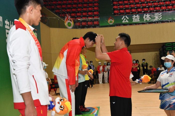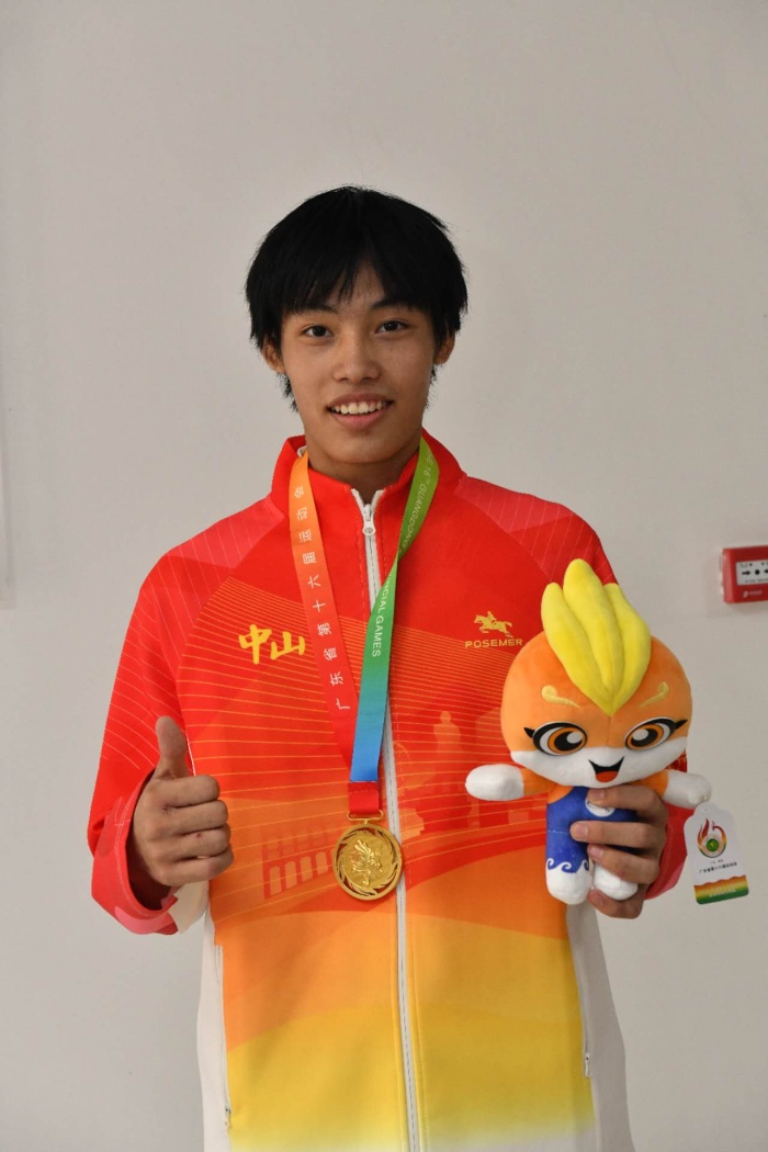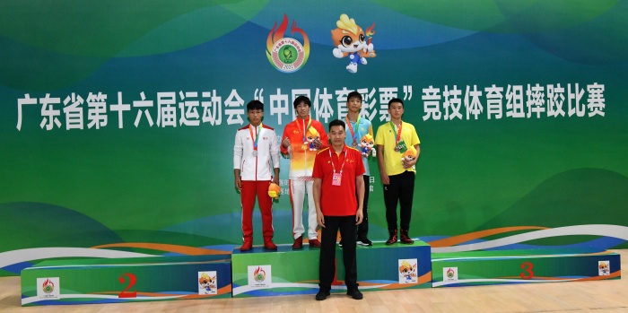 這是韋海龍首次參加省運會比賽,他的內心充滿了對冠軍的渴望。在前兩日的比賽中,隊友們連奪兩金,這既是對他最大的鼓勵,但同時也給他帶來了巨大的心理壓力。“心理壓力挺大的,總是想著比賽的事情。但教練說過的‘把訓練當比賽,把比賽當訓練’,讓我卸下了思想包袱,心里踏實了許多。”韋海龍賽后談到了此次比賽的感受。但令他意想不到的是,自己會以如此懸殊的比分把人生的首個省運會冠軍收入囊中。賽后,現場觀賽的中山市教體局陳威副局長為冠軍得主韋海龍頒發金牌。