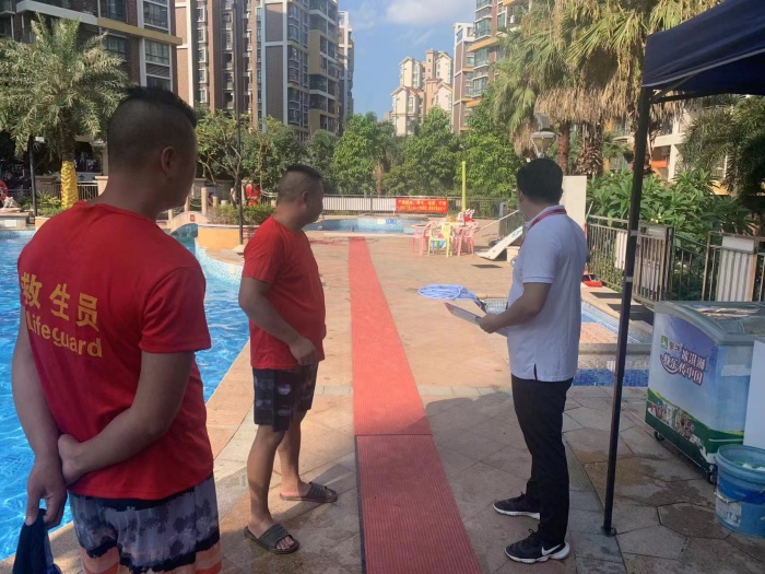 檢查二組則來到鎮內部分泳池進行檢查,重點查看泳池經營單位的防溺水預案及安全防護設施、防溺水警示標語、救生員持證上崗和救生設施設置等情況。檢查組要求各游泳經營場所要牢固樹立安全意識,提高救生技能,注重安全防范細節,做到“只要泳池有人,救生員必須在位”,確保不發生溺水事故。