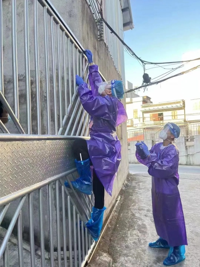 “簡老師身手敏捷,是抗疫路上的‘蛛蛛俠’!”和簡能標老師一起參加入戶走訪的同事戲謔說道。“大家都希望以時間賽跑,用最快速度撲滅疫情。”三角小學簡能標老師,在接到任務后第一個迅速到校。由于他負責走訪的住戶多為老舊樓房,經常一天要多次爬樓梯到六七樓開展走訪排查工作,盡管汗流浹背,但他從來沒有喊累喊苦。期間有些地方比較特殊,要通過攀爬才能貼門磁,簡老師已經50歲以上的人,但還是奮不顧身沖在前面,大家戲稱簡老師為抗疫"蛛蛛俠"。