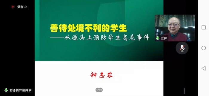 心理健康教育注重全體,還需關注學生個體發展,特別是有迫切心理需要的學生。浙江省心理特級教師鐘志農老師做了“善待處境不利的學生——從源頭上預防學生高危事件”的專題講座。鐘老師從一例令人扼腕的案例說起,引出青少年危機干預的誤區,強調我們應重點關注長期處境不利的學生。接著用具體的案例分析這類學生的特點與干預策略。鐘老師抽絲剝繭,從處境不利學生的特點和需要分析,強調危機干預工作重在察微知著,未雨綢繆,應在日常心理輔導等工作中發揮好“監測站”的作用,守護好學生的心理防線。