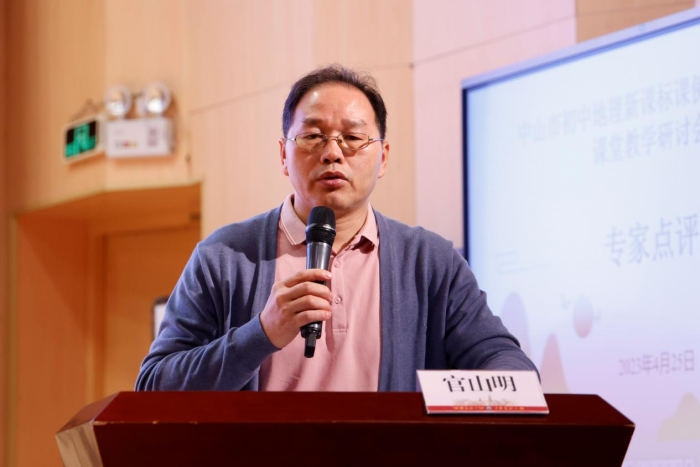 官山明老師分五個點對整個會議活動進行總結。第一,課堂設計要以課標為指導,以社會主義核心價值觀為引領。基于核心素養的課型應該有正確的價值觀,培養學生關鍵能力、必備知識。第二,本次的兩個課堂最后的開放性問題,凸顯了對核心素養的培養和創新思維的培養,“沒有結論就是最好的結論”,未來的課堂不應設限,要給學生的思維留足空間。第三,課堂設計的思路要開放,如采用最新的材料,以多學科的學習方式呈現,地理課與勞動教育相結合等。第四,課堂提問應及時關注學生的狀態,及時點撥,在課堂中落實以學生為主體,教師為主導,關注學生的思維過程。第五,教師應關注國家發展的動態,課堂設計要緊扣時代主題,甚至走出課堂,走進自然和社會,立足實際。最后,官老師表示,本次會議的課例是基于新課標提出的核心素養、學業質量及跨學科教育的要求,作出的第一次探索,希望以此推動所有教師不斷對新課標進行研讀和思考,并呈現到今后的課堂當中。