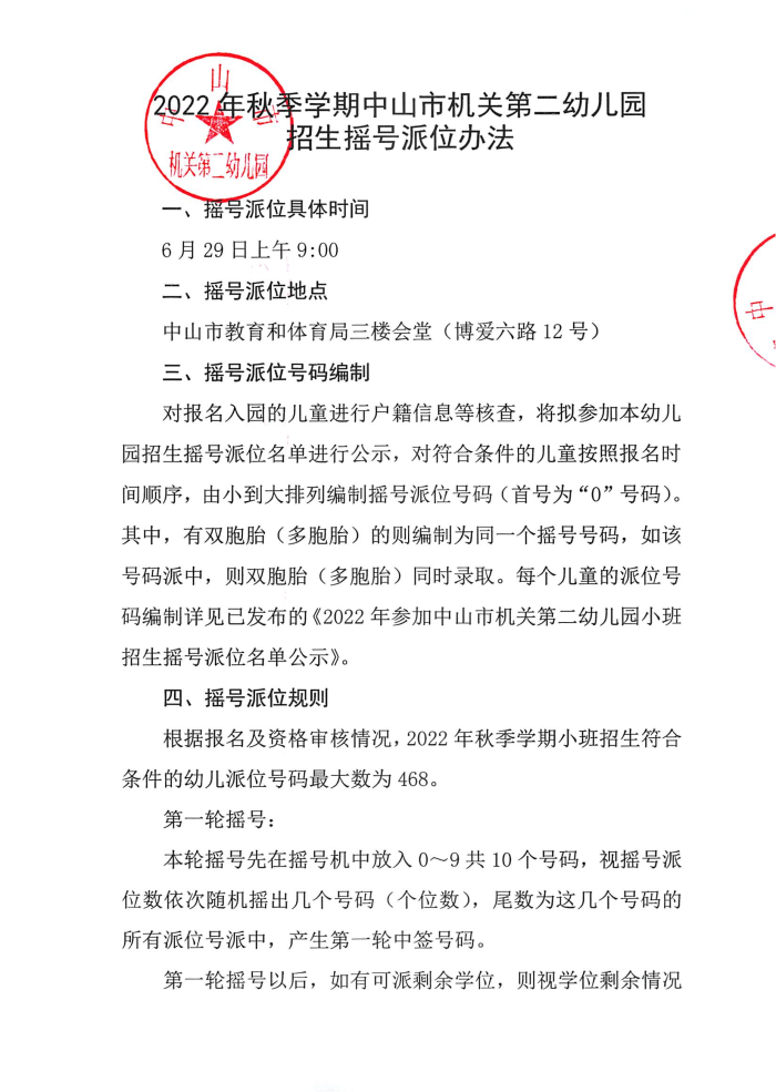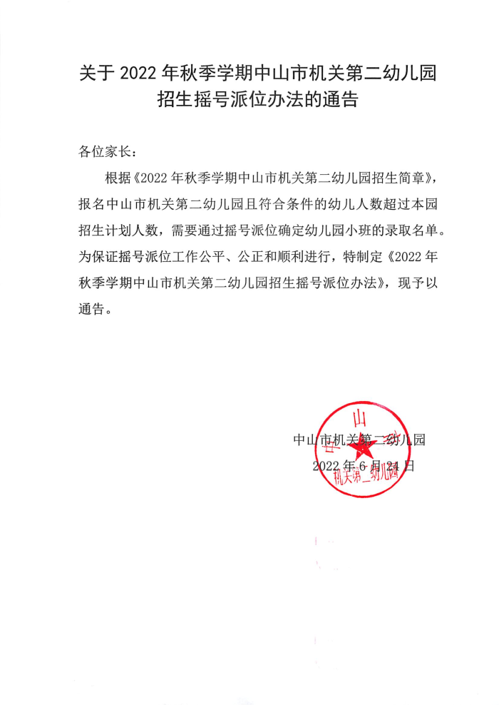 關(guān)于2022年秋季學(xué)期中山市機(jī)關(guān)第二幼兒園招生搖號(hào)派位辦法的通告