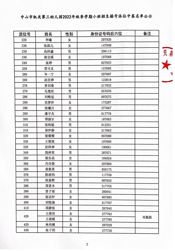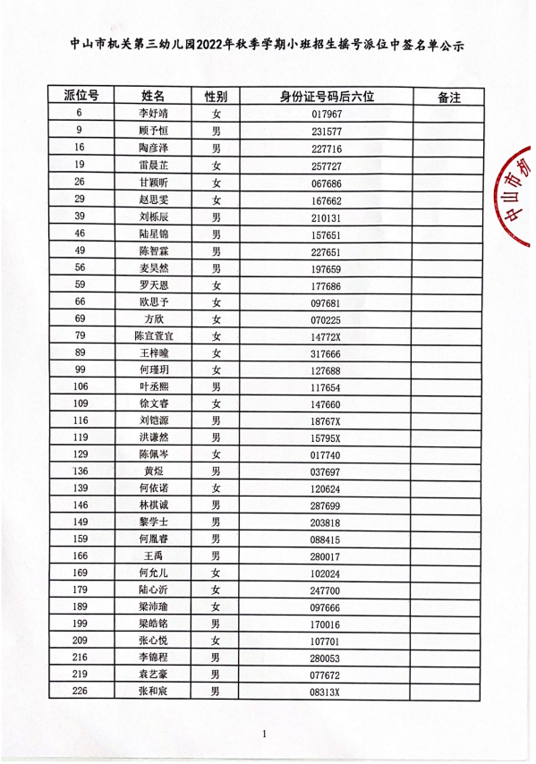 中山市機關第三幼兒園2022年秋季學期小班招生搖號派位中簽名單公示