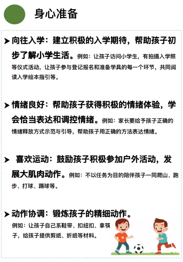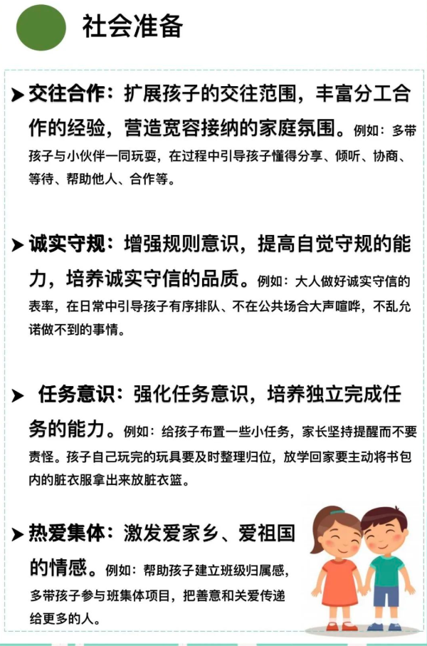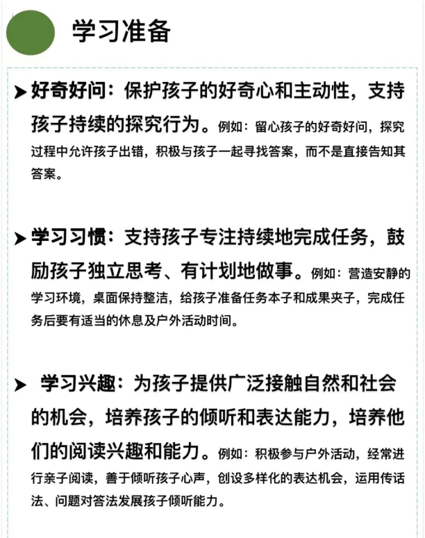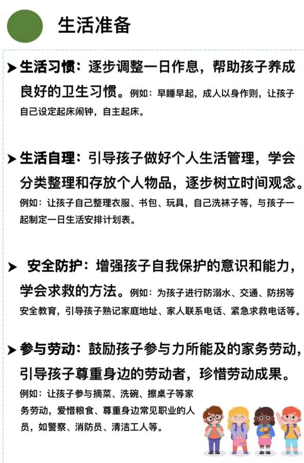 為讓家長更好地開展幼小銜接家庭教育工作,我園整理了身心準備、生活準備、社會準備、學習準備四方面的家庭版本指南供家長參考。