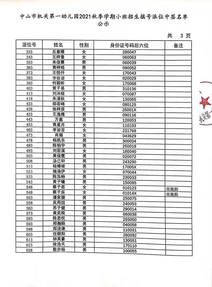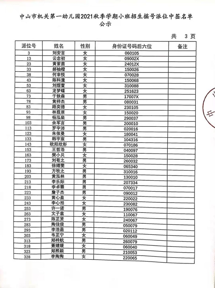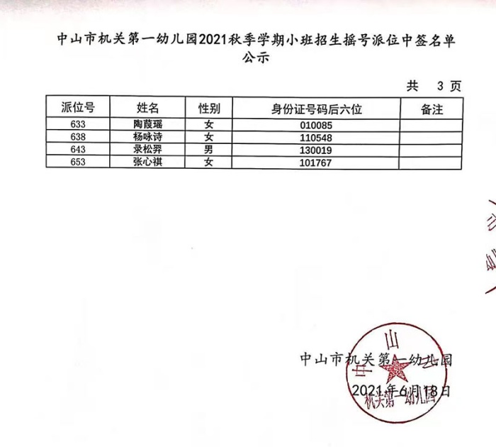 中山市機關第一幼兒園2021年秋季學期小班招生搖號派位中簽名單公示